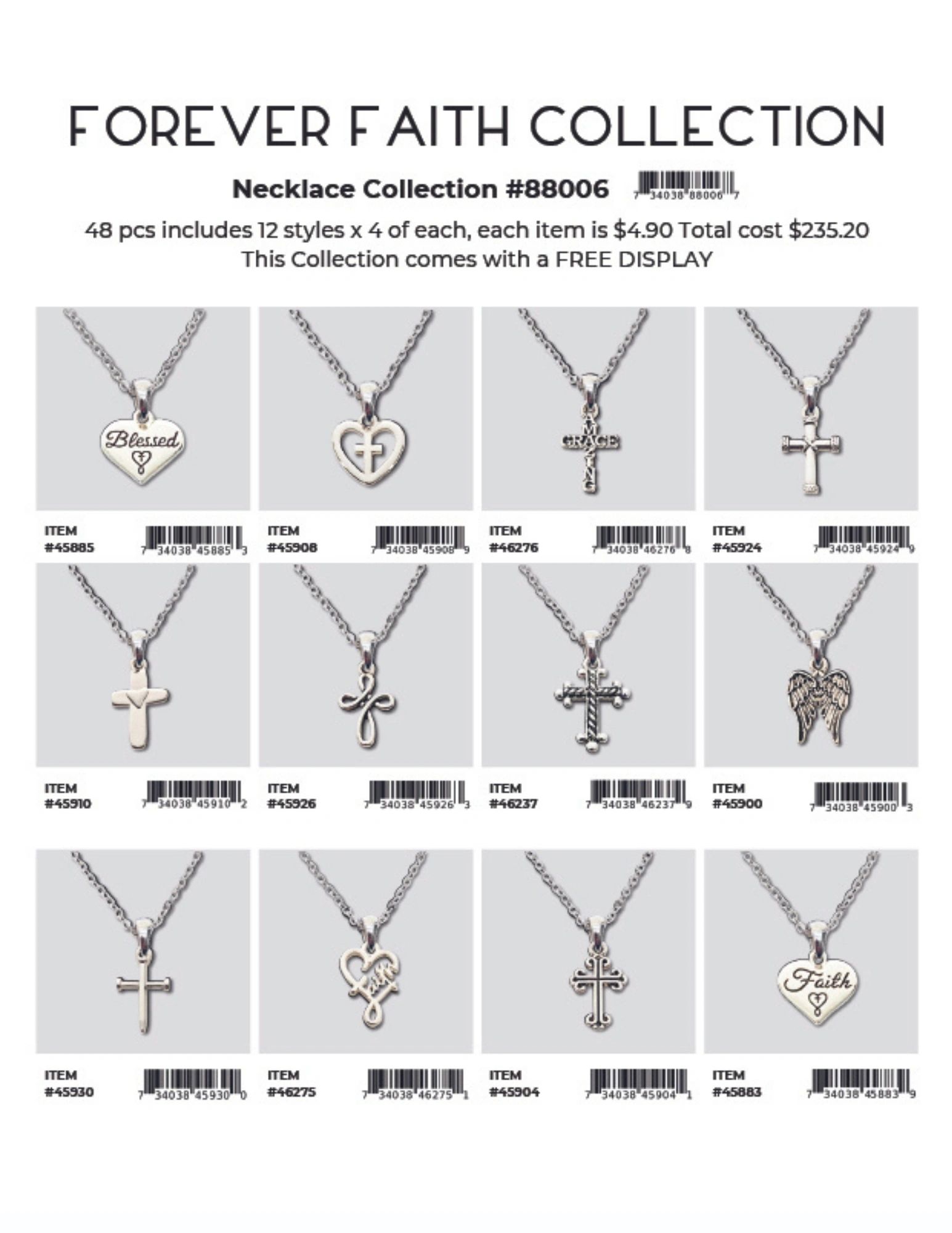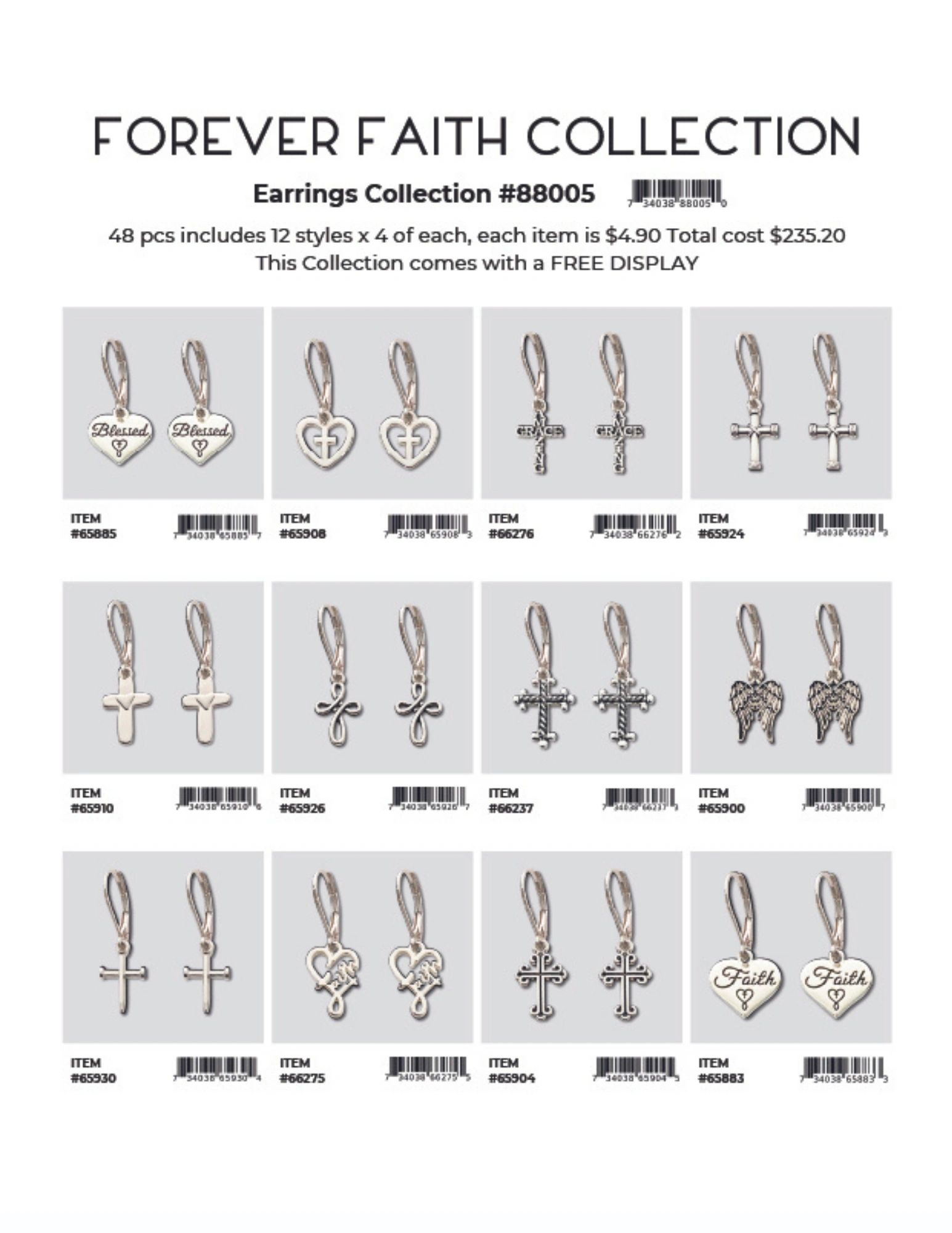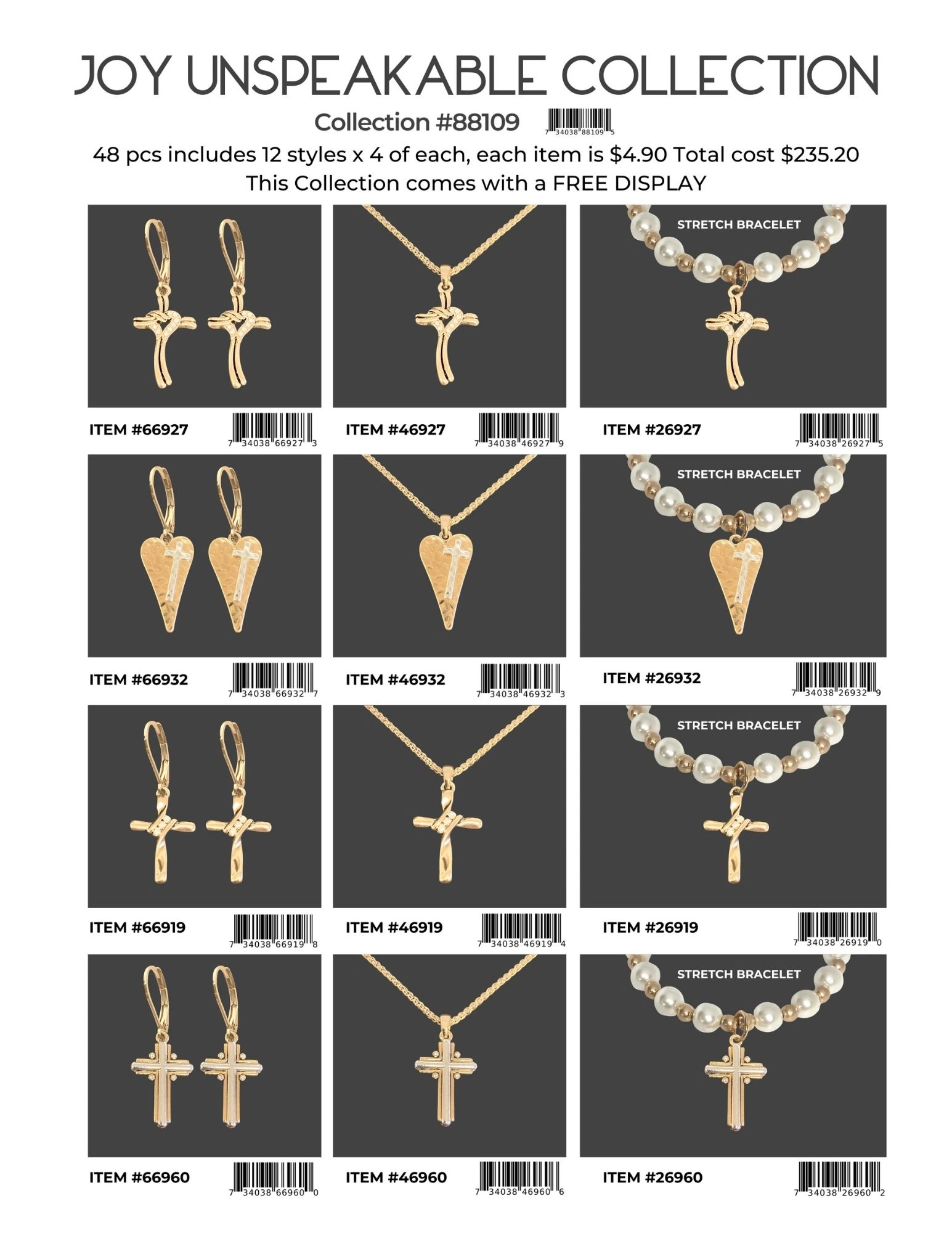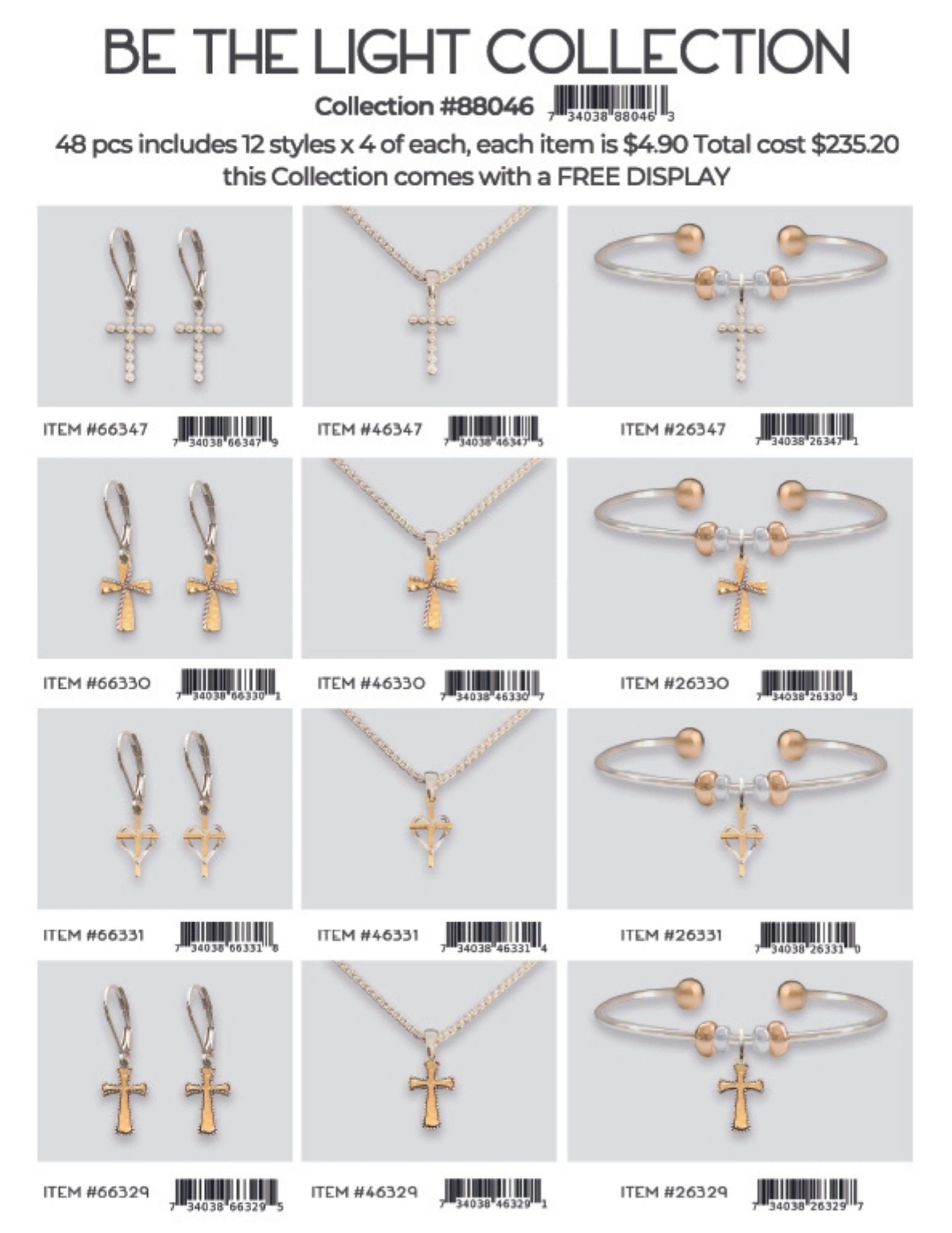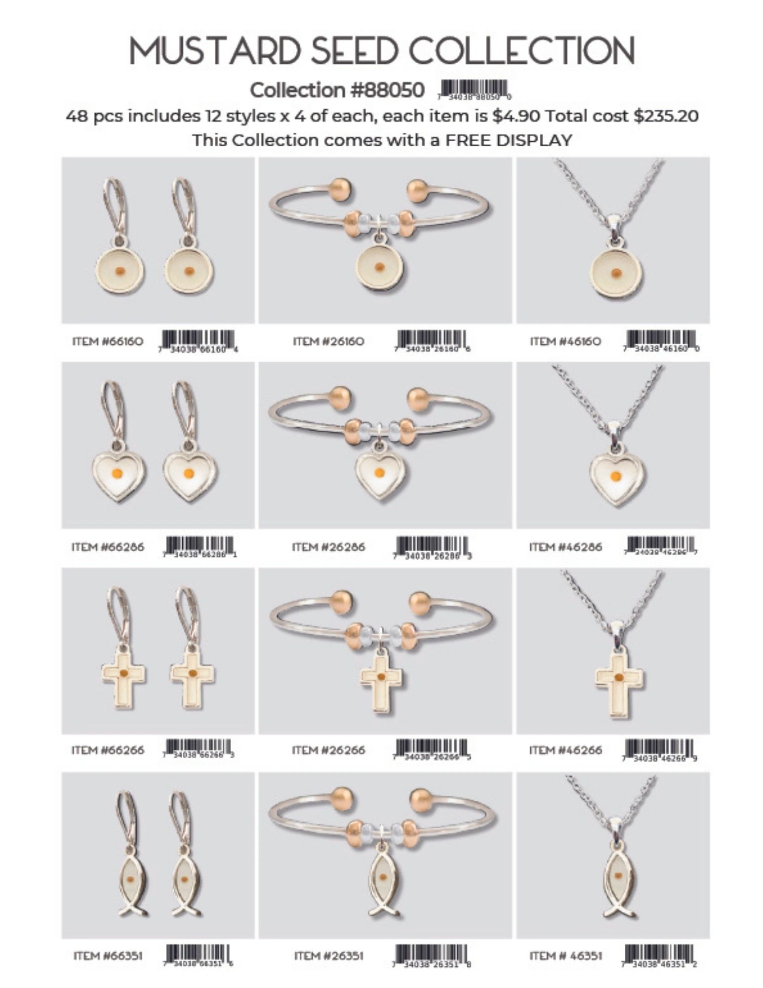 Each collection is 48 pcs includes 12 styles x 4 of each, each item is $4.90 Total cost is $235.20. Each collection comes with a FREE DISPLAY.