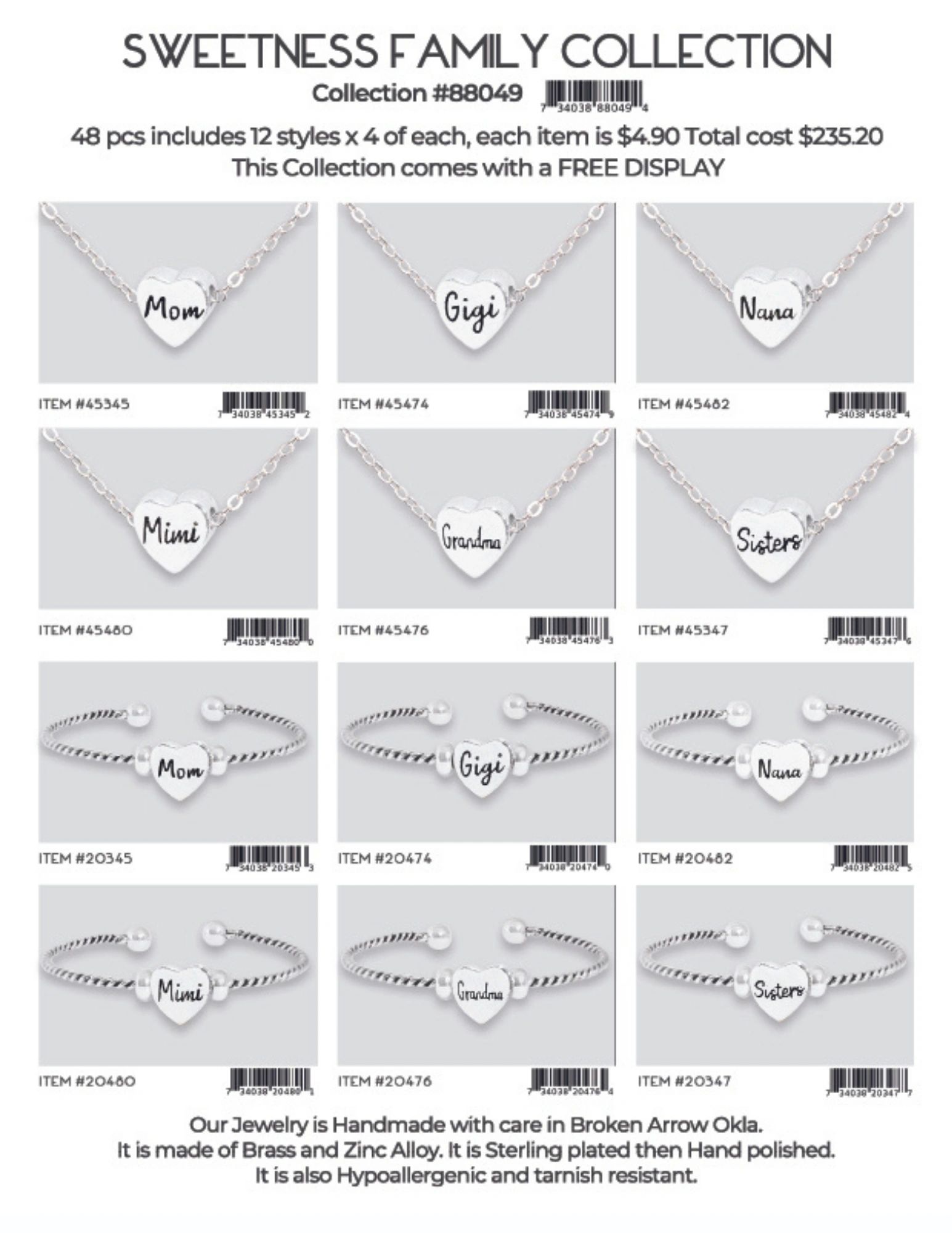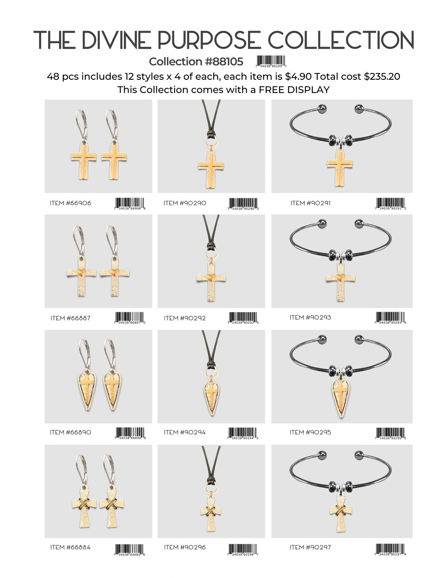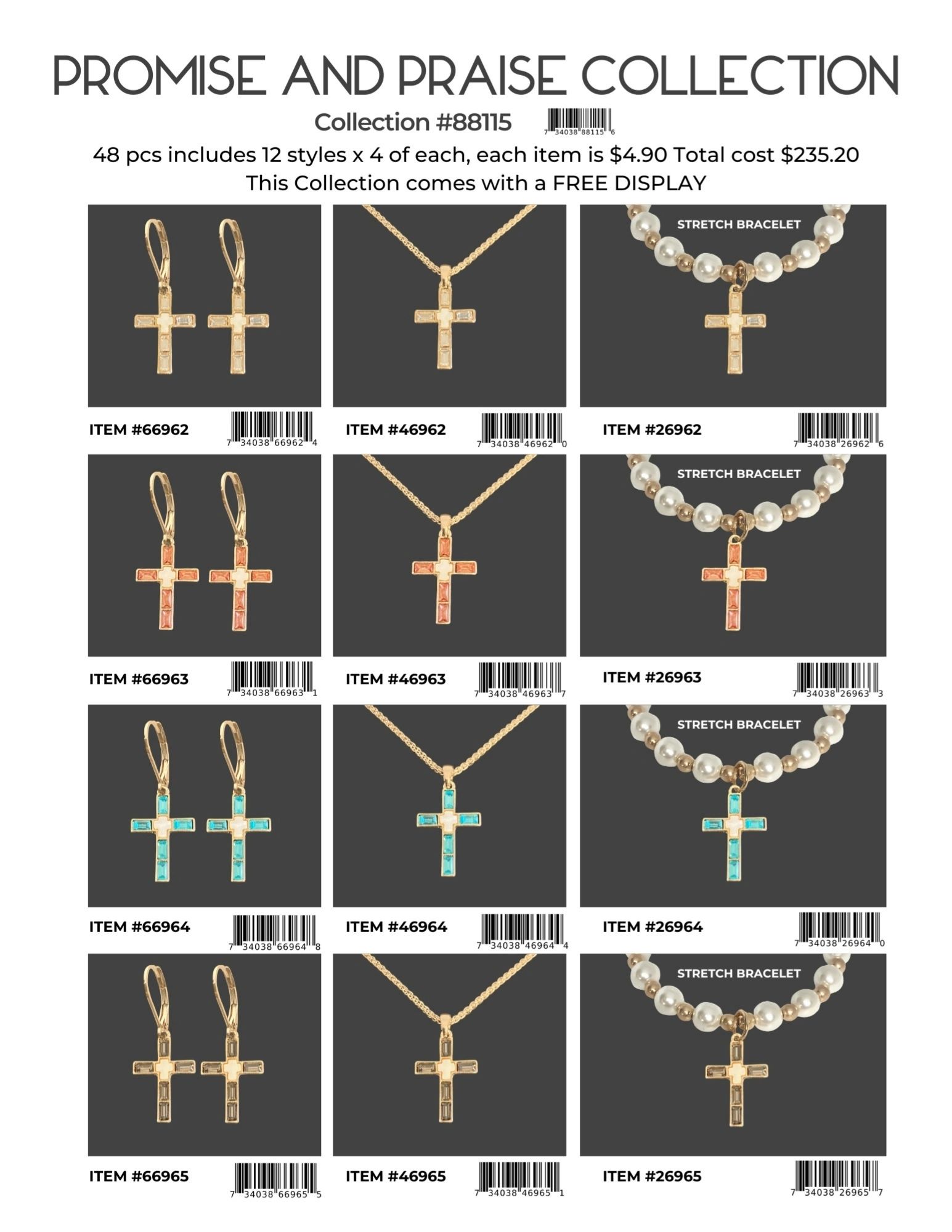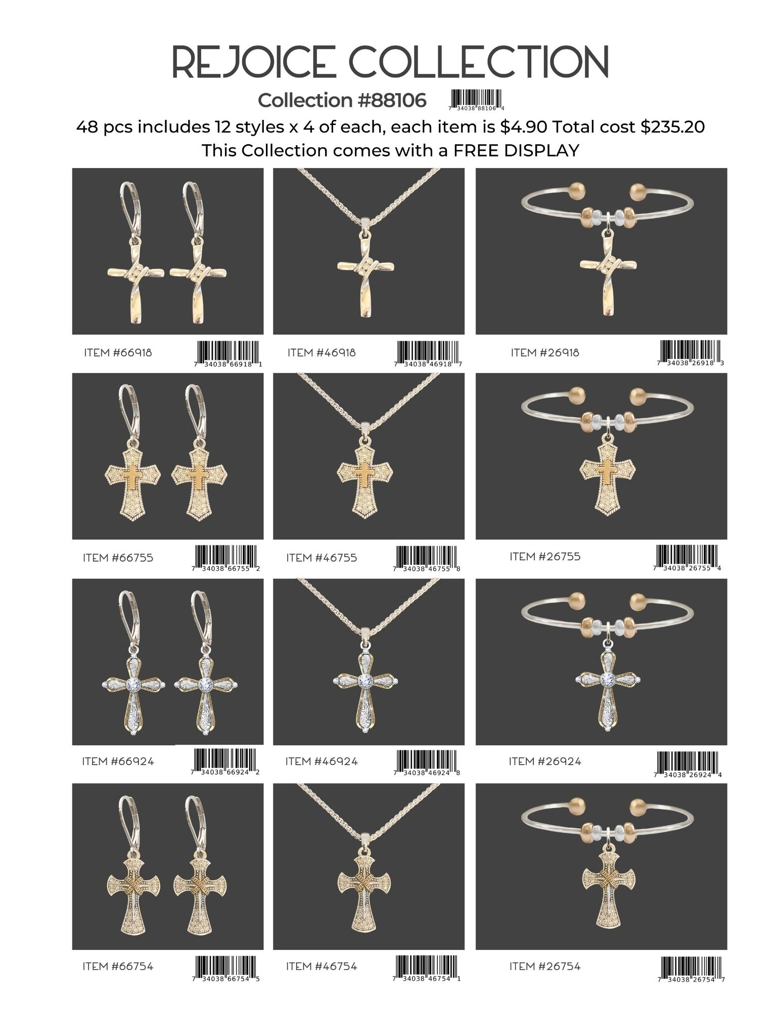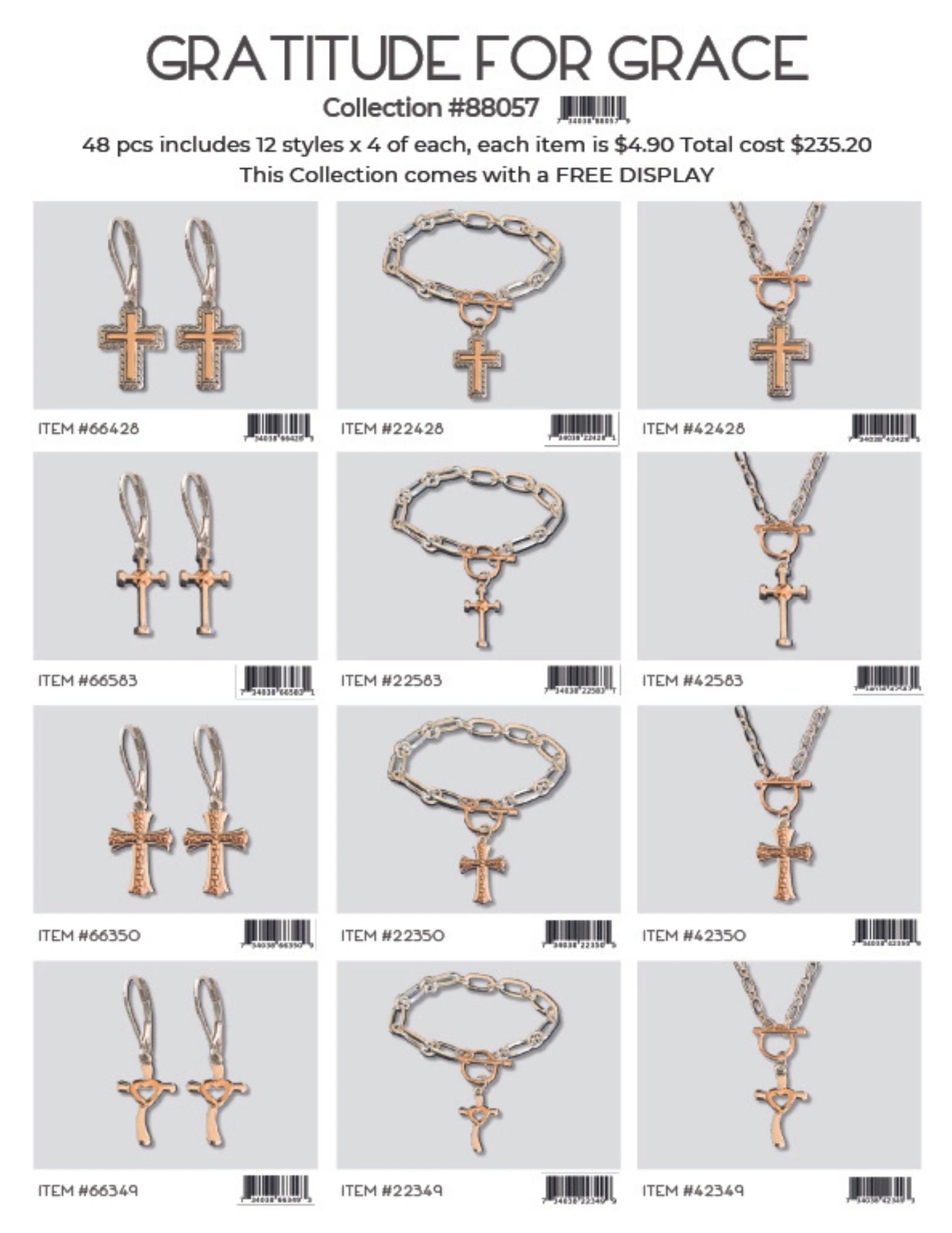Each collection is 48 pcs includes 12 styles x 4 of each, each item is $4.90 Total cost is $235.20. Each collection comes with a FREE DISPLAY.